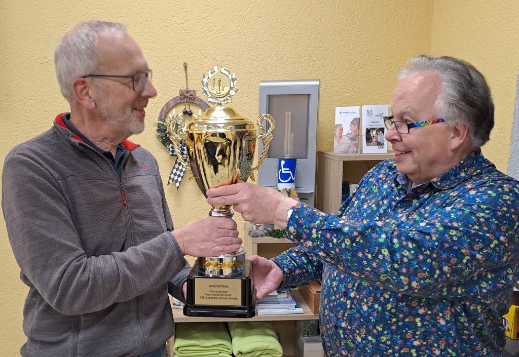 Schach gespielt wurde natürlich auch. Nach sieben Runden Schweizer System kam es zu einem Herzschlagfinale: Michael Glinzk und Jürgen Ebert hatten beide 6 Punkte gesammelt, aber Michael hatte bei der Feinwertung mit 0,5 Punkten die Nase vorn und holte sich damit den Wanderpokal. Dritter wurde Anil Essat mit 5 Punkten.