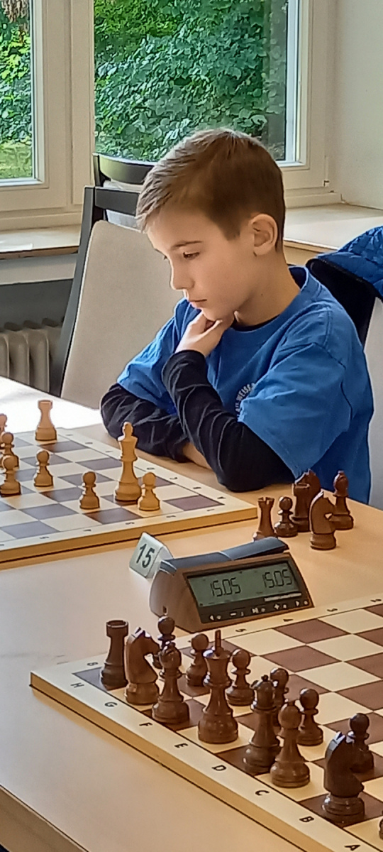 Kommen wir zu Erwin. Er war nach Startliste auf Rang 2, allerdings mehr als 350 DWZ-Punkte hinter dem haushohen Favoriten aus Mönchengladbach. Zunächst lief alles nach Plan. 3 Runden, 3 Siege. Dann war es in Runde 4 soweit, er rutschte vom zweiten aufs erste Brett und hatte es nun mit seinem direkten Rivalen zu tun. Die Partie hielt, was sie versprach. Es war spannend und im Verlauf unterliefen beiden Spielern Fehler. Lange war offen, wer das bessere Ende für sich haben würde. Doch dann schlug Erwins Stunde – er siegte im packenden Kampf – und sicherte sich Brett 1 auch für die nächste Runde. Erwin konnte tatsächlich gegen ihn gewinnen! Was für ein Sieg! Alle (Eltern und Vereinskolleginnen und -kollegen) staunten nicht schlecht und waren begeistert, freuten sich riesig mit Erwin – was für eine Überraschung! Aber es waren noch 3 Runden zu spielen und es gibt in diesem Alter viele junge Talente, die sehr gute Ansätze haben. In Runde 5 siegte Erwin dann erneut -noch 2 Runden vor dem möglichen Turniersieg. Eine kleine Schwäche konnte sich Erwin in der 6. Runde leisten – ein Remis. Das letzte Spiel sollte er gewinnen, um nichts anbrennen zu lassen – doch er siegte auch hier nicht, spielte auch da Remis – reichte das? JA, es reichte! Mit 6 aus 7 schaffte er den Sieg, punktgleich mit Platz 2 aber am Ende mit der besseren Wertung! Respekt für diese Leistung, Erwin! Für die Qualifizierung sollte da nichts mehr anbrennen.