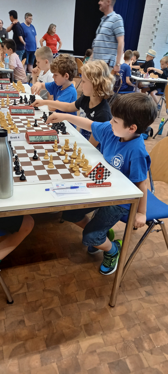 Für unseren jüngsten Nachwuchs nahmen diesmal Konstantin Klipert, Leon und Jonas Pempelfort, die bereits über Turniererfahrung verfügen und Till Rönsberg, Arnon Basil und Lukas Barchanowitz, die alle 3 ihr allererstes Schachturnier bestritten, teil. Die Mannschaften spielten mit jeweils 4 Spielern in 7 Runden. Da wir in diesem Jahr 6 Spieler dabei hatten, konnten wir regelmäßig durchwechseln, so dass jeder mindestens 2mal pausieren konnte.