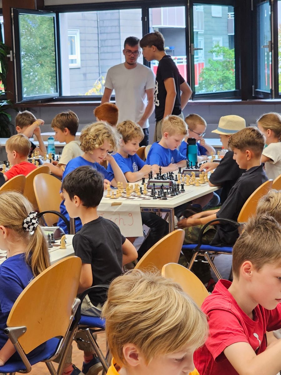 Am 8.9.2024 fand die diesjährige 4er Mannschaftsmeisterschaft der Schachjugend Niederrhein (Verbandsebene) in der Altersklasse U 10 in Monheim statt. Im letzten Jahr nahm bereits eine Mannschaft unseres Vereins teil, in diesem Jahr konnten wir sogar mit 2 Mannschaften an den Start gehen. Leider gab es am Morgen des Wettkampftages noch eine Absage aus gesundheitlichen Gründen, so dass beide Mannschaften nur mit 4 Spielern an den Start gehen konnte. Das hieß für alle, dass sie das ganze Turnier durchspielen mussten, was bei den Temperaturen und den Bedingungen im Spielsaal nicht so ganz einfach war. Andere Teams konnten hingegen durchwechseln. Es wurden 7 Runden gespielt. Unsere beiden Mannschaften hatten jedoch jeweils eine Runde frei, da 19 Mannschaften an den Start gingen.