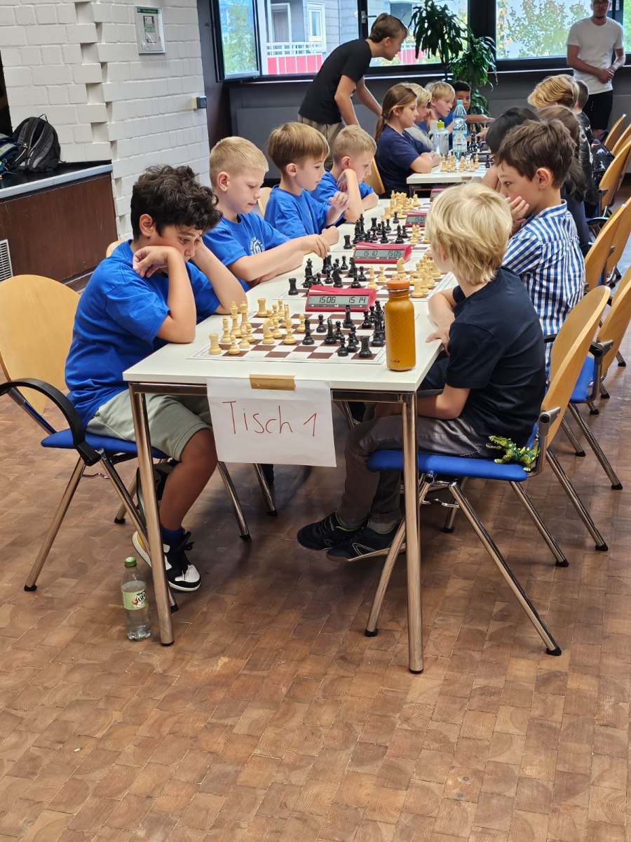Am 8.9.2024 fand die diesjährige 4er Mannschaftsmeisterschaft der Schachjugend Niederrhein (Verbandsebene) in der Altersklasse U 10 in Monheim statt. Im letzten Jahr nahm bereits eine Mannschaft unseres Vereins teil, in diesem Jahr konnten wir sogar mit 2 Mannschaften an den Start gehen. Leider gab es am Morgen des Wettkampftages noch eine Absage aus gesundheitlichen Gründen, so dass beide Mannschaften nur mit 4 Spielern an den Start gehen konnte. Das hieß für alle, dass sie das ganze Turnier durchspielen mussten, was bei den Temperaturen und den Bedingungen im Spielsaal nicht so ganz einfach war. Andere Teams konnten hingegen durchwechseln. Es wurden 7 Runden gespielt. Unsere beiden Mannschaften hatten jedoch jeweils eine Runde frei, da 19 Mannschaften an den Start gingen.
