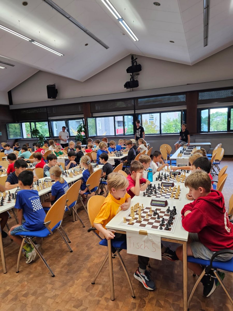 Am 8.9.2024 fand die diesjährige 4er Mannschaftsmeisterschaft der Schachjugend Niederrhein (Verbandsebene) in der Altersklasse U 10 in Monheim statt. Im letzten Jahr nahm bereits eine Mannschaft unseres Vereins teil, in diesem Jahr konnten wir sogar mit 2 Mannschaften an den Start gehen. Leider gab es am Morgen des Wettkampftages noch eine Absage aus gesundheitlichen Gründen, so dass beide Mannschaften nur mit 4 Spielern an den Start gehen konnte. Das hieß für alle, dass sie das ganze Turnier durchspielen mussten, was bei den Temperaturen und den Bedingungen im Spielsaal nicht so ganz einfach war. Andere Teams konnten hingegen durchwechseln. Es wurden 7 Runden gespielt. Unsere beiden Mannschaften hatten jedoch jeweils eine Runde frei, da 19 Mannschaften an den Start gingen.